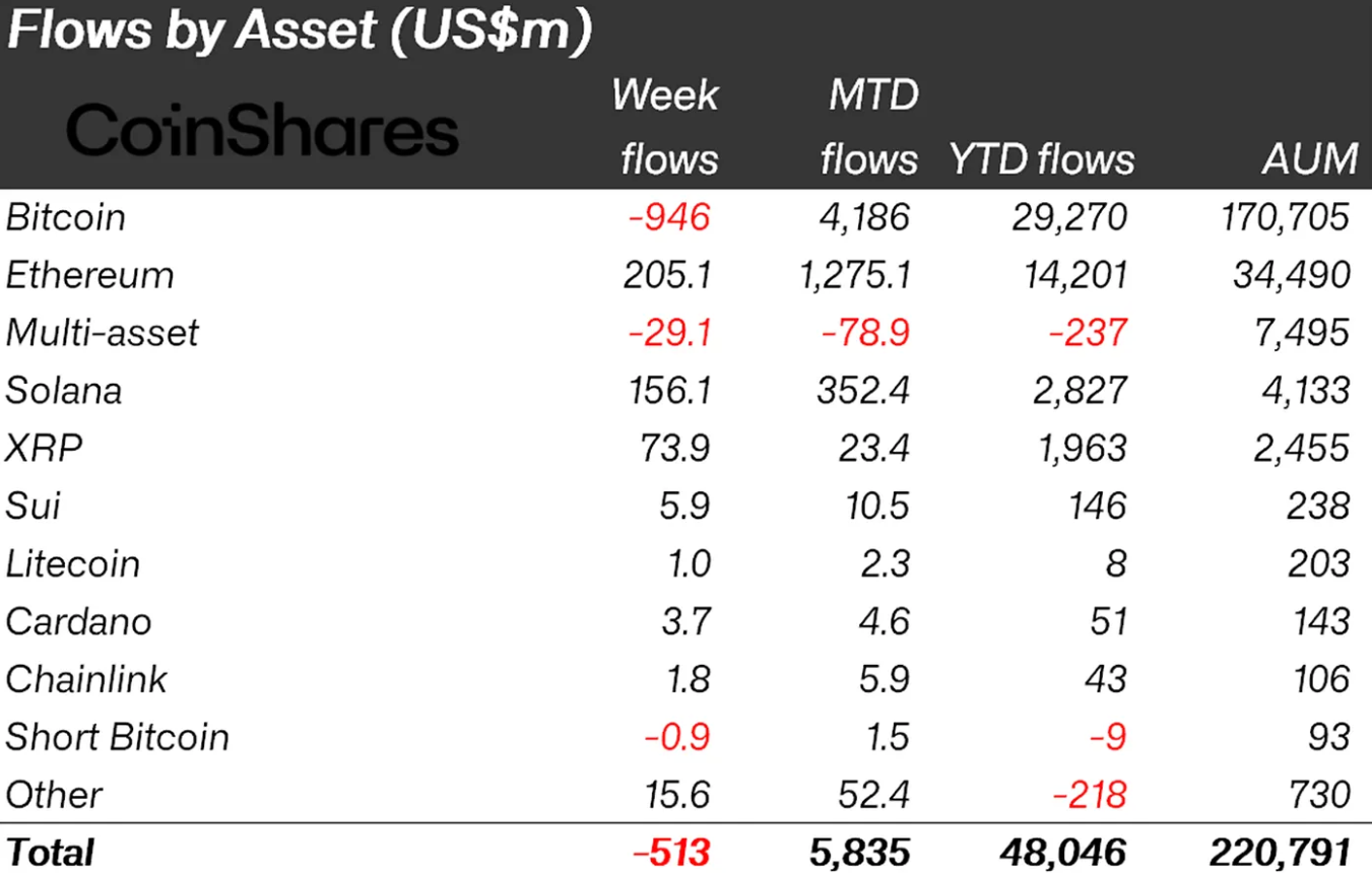 Karşılaştırıldığında, küresel kripto para birimi yatırım ürünleri 513 milyon dolarlık net çıkış gördü; Yatırımcılar, özellikle geçen hafta toplam 946 milyon dolarlık çıkış gören Bitcoin (BTC) ile ilgili riskleri azalttı.
