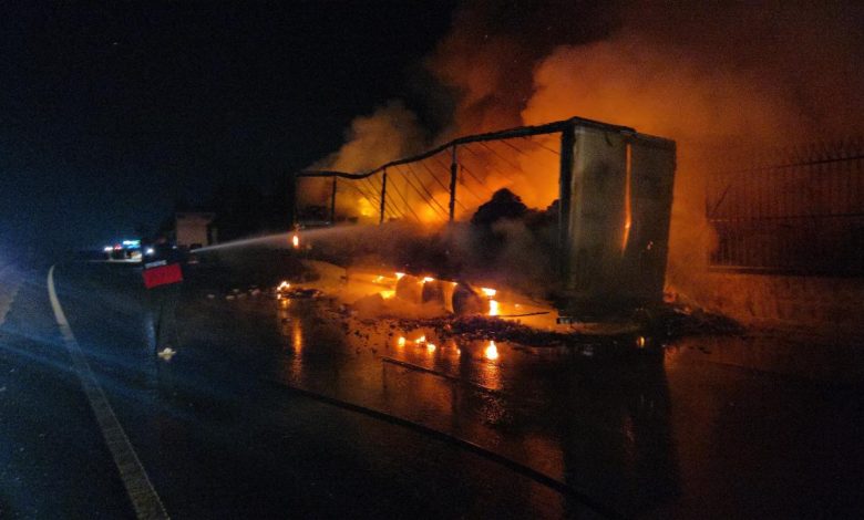 Yalova-Kocaeli karayolu Çiftlikköy ilçesi yakınlarında konserve yüklü kamyonun römorkunda henüz bilinmeyen bir nedenle yangın çıktı.